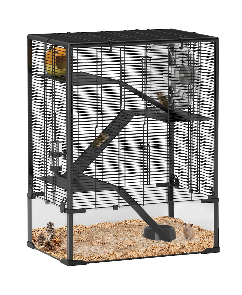 Discover the PawHut mice cage, where fun meets function! With a tempered glass bottom and 9.1"" height, you can create a cozy natural habitat with paper or wood chips. The spacious 4-tier design includes platforms, ramps, and even a hut, ensuring your furry friend's relaxation and entertainment.