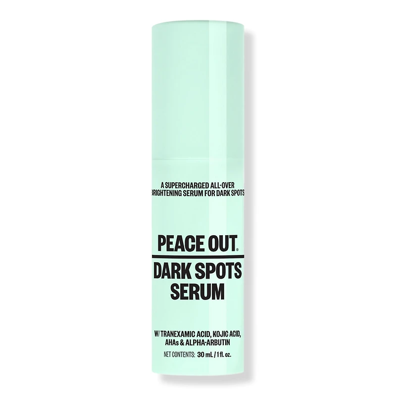 PEACE OUT DARK SPOTS SERUM 1.0FLOZ. Benefits: Loaded with a potent blend of 2.5% Tranexamic Acid and 10% AHAs, this fragrance-free brightening solution refines skin's surface by revealing fresh skin cells, while brightening boosters, Kojic Acid & Alpha Arbutin, target dark spots at the source for both visible improvement AND long term payoff. 91% of participants said this product improves the appearance of dark spots after 2 weeks. 91% of participants said the product did not leave their skin feeling sensitive or irritated after 2 weeks. 91% of participants said their dark spot(s) appear lighter in color where the product was applied after 6 weeks. Key Ingredients: 2.5% TRANEXAMIC ACID - An amino acid derivative that helps minimize the appearance of dark spots. 10% AHA Blend - helps improve the appearance of uneven skin tone and texture. 0.5% Kojic Acid & 2.5% Alpha-Arbutin - provide brightening benefits to visibly minimize the look of discolorations. Formulated Without: Parabens. Gluten. Aminomethyl. Artificial Colorant & Flavors. BPA(Bisphenol A). Formaldehydes. Synthetic Fragrance (>1%).