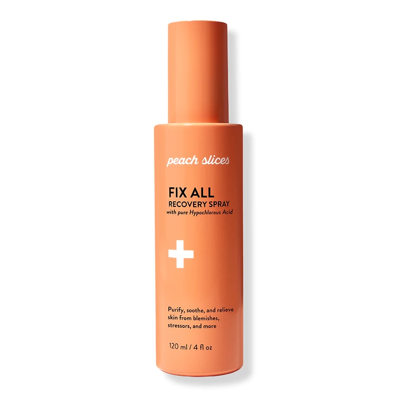 FIX ALL RECOVERY SPRAY 4.0FLOZ. Benefits: pH-stabilized formula with antibacterial properties visibly cleanses, purifies, and soothes signs of irritationwithout stripping or drying. Daily, does-everything solution visibly clears blemishes, alleviates irritation, supports the skin barrier, refreshes, and hydrates skin. Gentle formula is ideal for all ages and skin types, and can be layered under or over makeup. Powered by K-Beauty innovation, Peach Slices offers easy, clinical solutions, for tough skin issues, with derm-approved products that meet the highest beauty standards and are also silicone-free, fragrance-free, alcohol-free, and formulated without any harsh chemicals.. Key Ingredients: Hypocholorous Acid: the same compound produced naturally in skin that helps protect from bacteria, inflammation, redness, and irritation. Electrolyzed Water: premium saline solution that helps cleanse and purify. Research Results: 95% saw visibly reduced and faded dark spots within 72 hours*. 97% reported less noticeable blemish scarring in just 7 days*. 97% said Microdarts work on even their most stubborn dark spots*. *3rd party consumer study results.