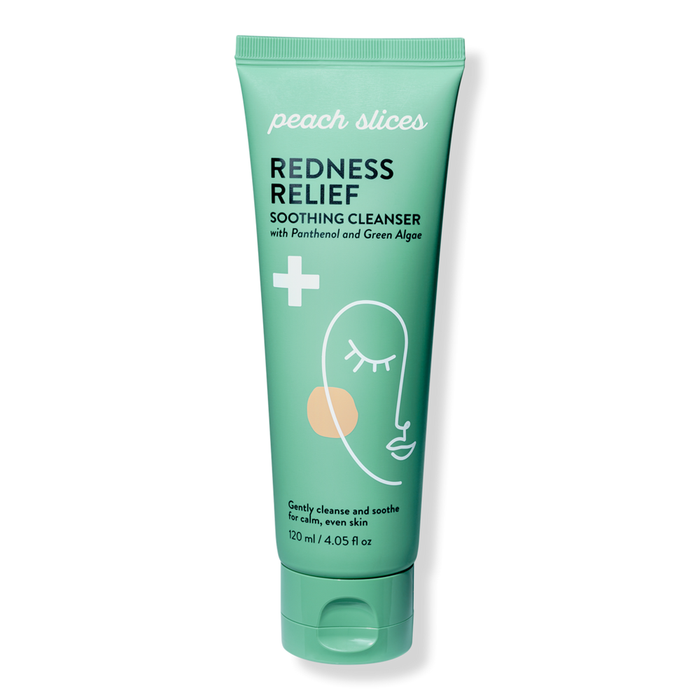 REDNESS RELIEF SOOTHING CLEANSER 4.1OZ. Benefits: Gently cleanses impurities without stripping skin. Visibly reduces signs of redness and soothes skin. Milky gel formula strengthens the skin barrier. Effective and fun: Peach Slices formulas are formulated for all skin types and deliver holistic and easy solutions for stubborn skin issues. Powered by K-Beauty innovation, Peach Slices offers easy, clinical solutions, for tough skin issues, with derm-approved products that meet the highest beauty standards and are also silicone-free, fragrance-free, alcohol-free, and formulated without any harsh chemicals.. Key Ingredients: Green Algae: conditions, hydrates, softens, and detoxifies skin. Panthenol: helps restore the skin barrier. Allantoin: botanical extract that helps soothe and protect skin. Rhodomyrtus: fights blemishes and reduces signs of inflammation. :