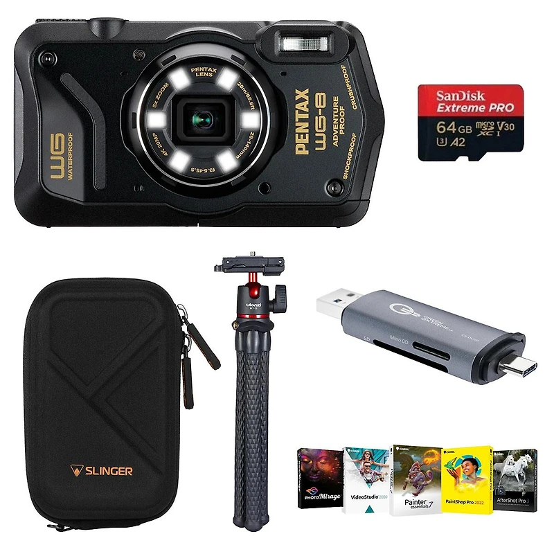 Pentax Wg-8 All-Weather Camera, Bundle with 64GB Memory Card, Case, Mt-11 Tripod, Card Reader, Software Kit