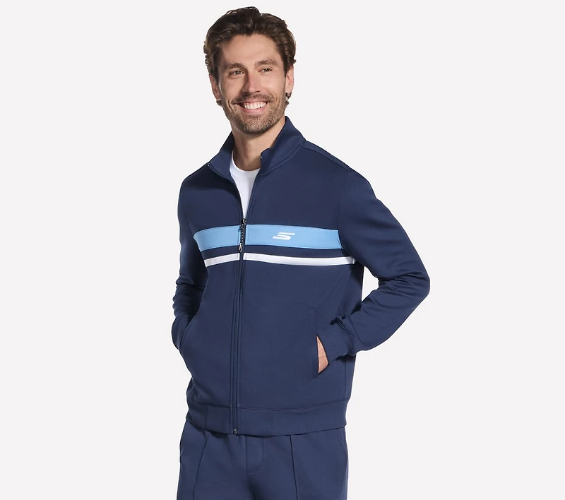 Keep a clean sporty profile wearing Skechers Performance™ Track Jacket. This full zip track jacket is made with our 4-way stretch SKECH-KNITS™ Classic fabric and features a ribbed interior collar, cuffs, and bottom hem, front hand welt pockets, and contrast back and chest taping. Part of a coordinating set.