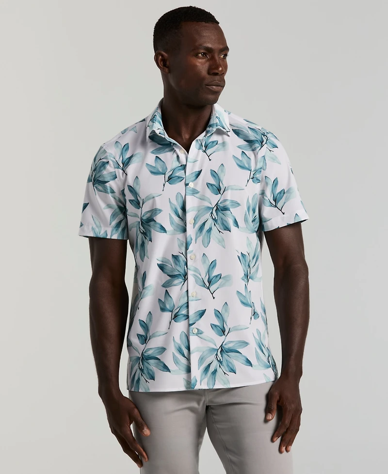 This Perry Ellis men's short-sleeve shirt features a vibrant magnolia leaf print on a stretchy, comfortable polyester-blend fabric. It includes moisture-wicking technology to keep you fresh and a versatile spread collar for added comfort. Ideal for both casual and semi-formal looks, the shirt offers easy movement and stylish everyday wear.