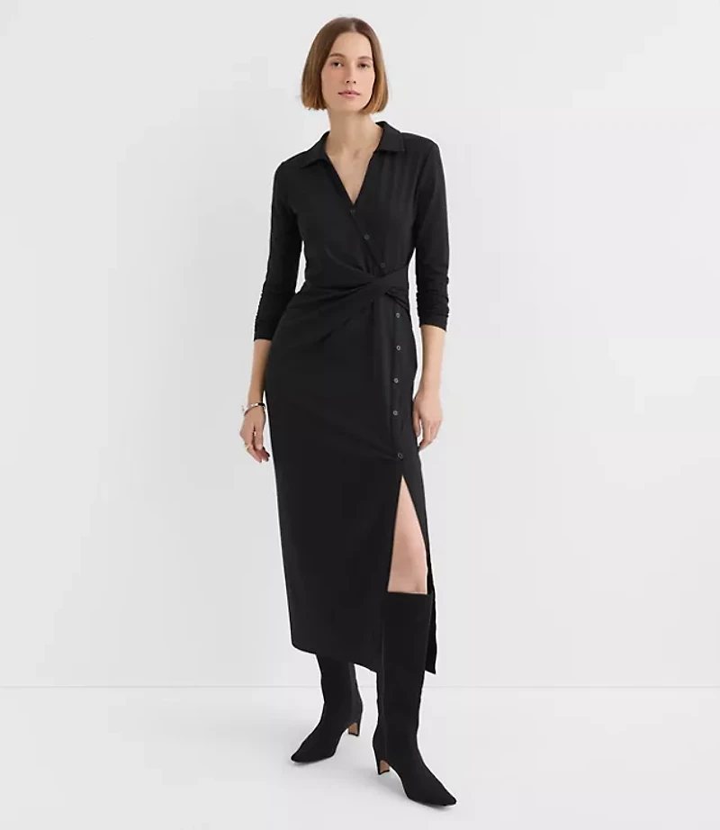 In the softest cotton blend knit, this button trimmed midi flaunts modern chic - with a flattering twist. Crossover V - neck. Long sleeves Side zip, Imported:, Fit: Shift - fits straight and relaxed, Length: 43 1/2"from center back neck to hem, measured from a size 8 / M, Fabrication: 57% Cotton 38 Modal 5 Spandex, Garment Care: Machine Washable Loft Petite Button Twist Midi Dress Size 2XS Black Women's by Loft Size Petite - 2XS Black Women's Shift, Dresses Work 57% Cotton 38% Modal 5% Spandex Machine Washable