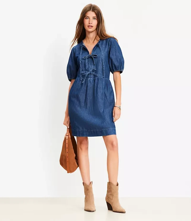 Tied together with a trio of the sweetest bows, this pure cotton chambray dress has the gift of it - girl style. Crew neck Short sleeves with elasticized cuffs. Onseam pockets, Imported:, Fit: Waisted - fits and flatters waist, Length: 33 3/4"from center back neck to hem, measured from a size 8 / M, Fabrication: 100% Cotton, Garment Care: Machine Washable Loft Petite Chambray Bow Mini Pocket Dress Size Medium Sapphire Blue Wash Women's by Loft Size Petite - M Sapphire Blue Wash Women's Fit, & Flare Dresses Everyday 100% Cotton Machine Washable