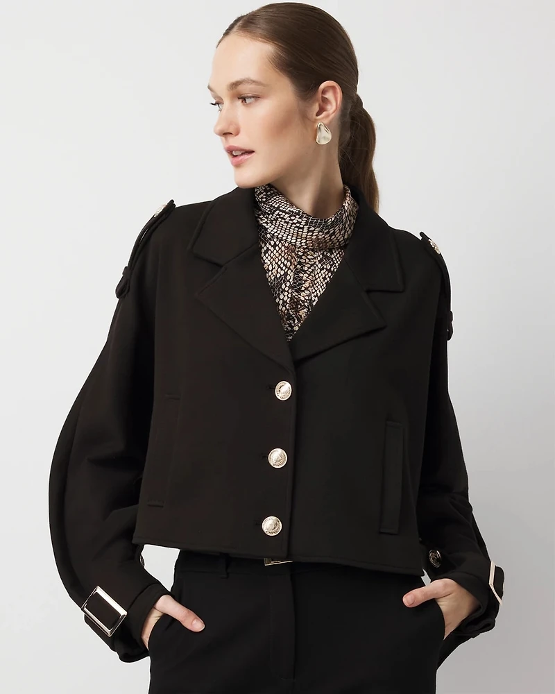 We've reinvented the trench. Crated with knit fabric, this jacket features elements of a classic trench coat, like the collar & epaulets, but in a shorter length for a more fashion-forward look. Wear it with high rise denim and pants during the transition seasons.