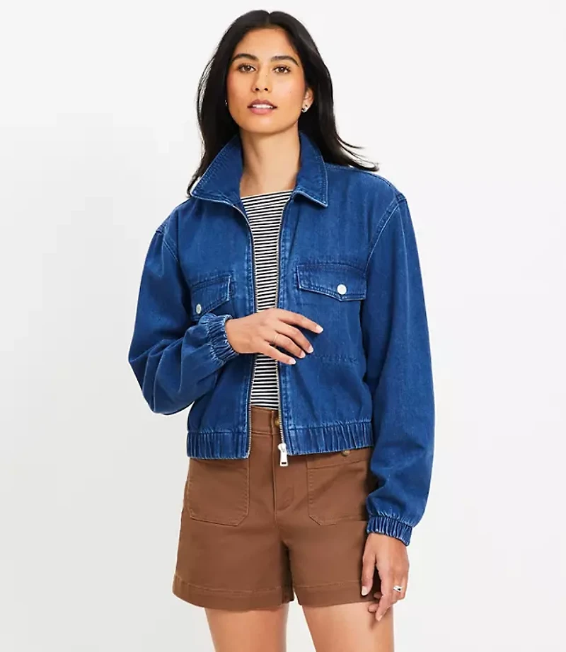 Get in the effortlessly cool layering game with this fresh jacket, a must - have bubble hem style done in structured woven cotton blend denim. Point collar Long sleeves with elasticized cuffs. Button flap chest pockets. Front zip Elasticized hem, Imported:, Fit: Classic follows your contours with a little room, Length: 19"long, Fabrication: 65% Cotton 35 Lyocell, Garment Care: Machine Washable Loft Petite Denim Bubble Jacket Size Small Classic Mid Wash Women's by Loft Size Petite - S Classic Mid Wash Women's Denim, Outerwear 65% Cotton 35% Lyocell Machine Washable