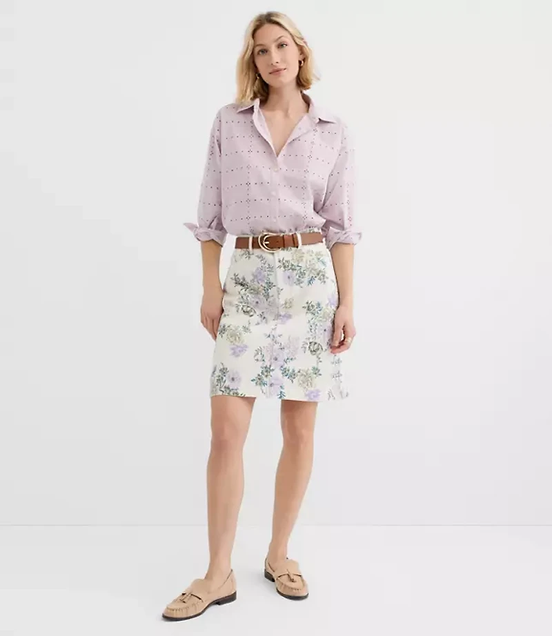 This soft cotton blend skirt does denim's cool attitude with a femme twist. Front zip with button closure. Belt loops Five - pocket styling., Imported:, Length: 17 1/2"long, Fabrication: 100% Cotton, Garment Care: Machine Washable Loft Petite Denim Mini Skirt in Floral Size 00 Whisper White. Women's by Loft Size Petite - 00 Whisper White. Women's Shift, Skirts 100% Cotton Machine Washable