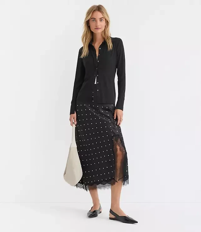 Pindot Lace Trim Satin Bias Maxi Skirt
