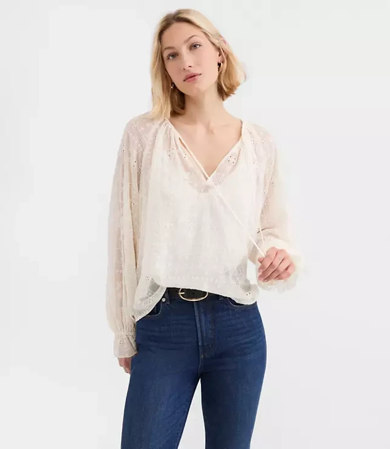Petite Eyelet Ruffle Cuff Tie Neck Blouse