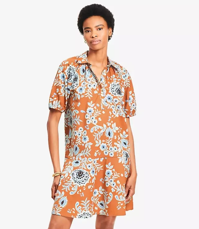 Petite Floral Linen Blend Ruffle Neck Mini Dress