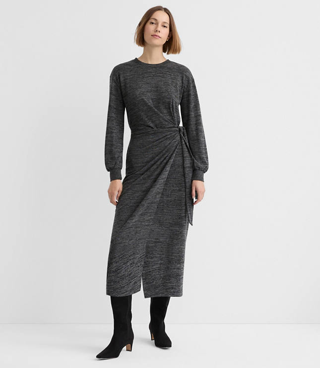 All the comfy, relaxed yet refined cool of a soft sweater knit jersey - in an endlessly flattering side pleated midi wrap dress? Sign us up! Crew neck. Long sleeves Adjustable ties, Imported:, Fit: Waisted - fits and flatters waist, Length: 44 1/4"from center back neck to hem, measured from a size 8 / M, Fabrication: 81% Polyester 17 Rayon 2 Spandex, Garment Care: Machine Washable Loft Petite Jersey Side Pleated Midi Wrap Dress Size 2XS Black Neutral Women's by Loft Size Petite - 2XS Black Neutral Multi Women's Fit, & Flare Dresses Everyday 81% Polyester 17% Rayon 2% Spandex Machine Washable