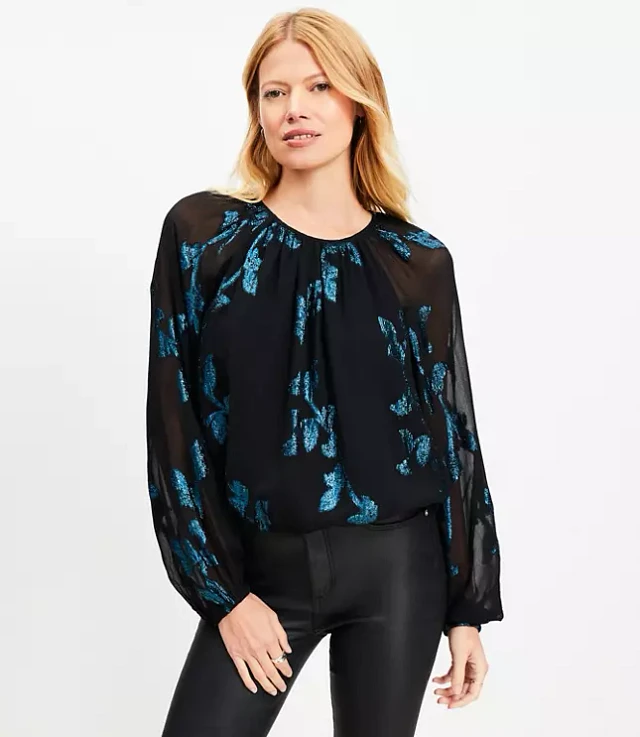 Petite Stamped Puff Sleeve Tie Front Blouse