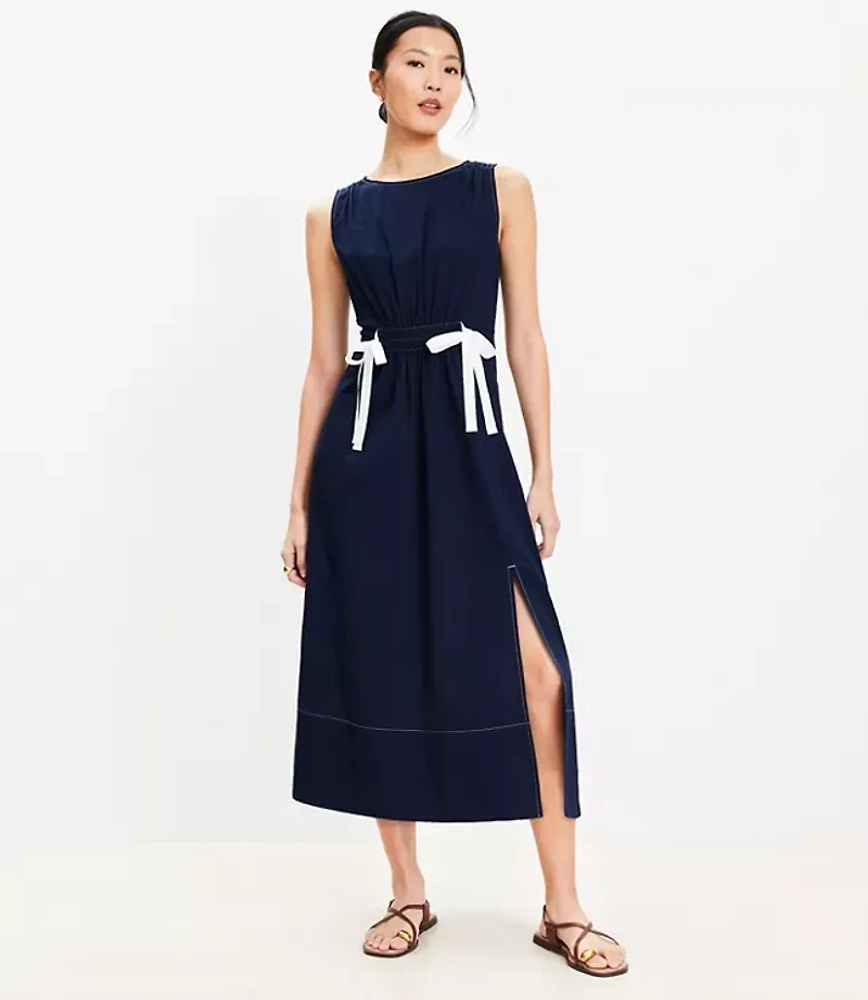 With contrast grosgrain ribbon side ties and stitching, this fluid woven stretch cotton midi ties up your look with modern pretty. Crew neck Sleeveless Elasticized waist Adjustable side ties. Side slit Button back keyhole., Imported:, Fit: Waisted - fits and flatters waist, Length: 45"from center back neck to hem, measured from a size 8 / M, Fabrication: 96% Cotton 4 Spandex, Garment Care: Machine Washable Loft Petite Side Tie Midi Dress Size XL Deep Space Blue Women's by Loft Size Petite - XL Deep Space Blue Women's Fit, & Flare Dresses Work 96% Cotton 4% Spandex Machine Washable