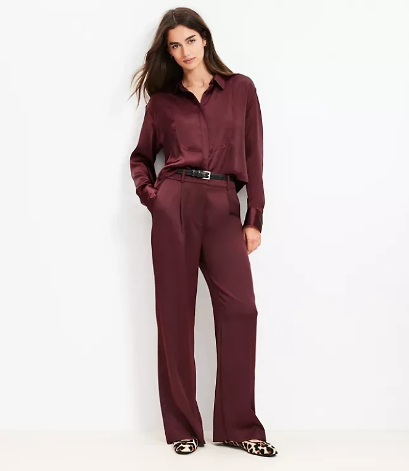 Pants Details: Front zip with hook and bar closure. Belt loops Slash pockets Back welt pockets., Leg Shape: Peyton Trouser - relaxed through the hip and thigh, with a flattering wide leg, Rise: Sits at high waist, 12 7/8"rise, Imported:, Fit: Perfectly polished for everyday - with sleek front pleats from the waist down, Length: Full length, 31"inseam, Fabrication: 100% Polyester, Garment Care: Machine Washable Loft Peyton Trouser Pants in Satin Size 4 Red Raisin Women's by Loft Size Regular - 4 Red Raisin Women's Regular, Trouser Pants 100% Polyester Machine Washable