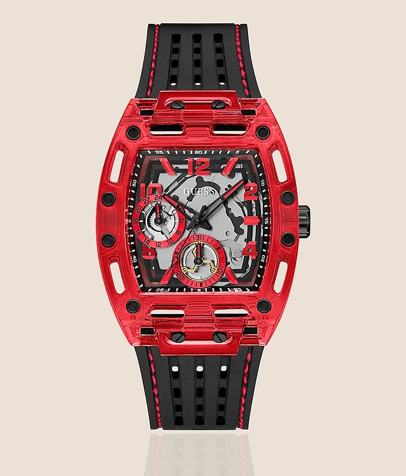 Stainless steel case back watch Three-hand quartz movement Multi function subdials Silicone strap Case measures 44mm