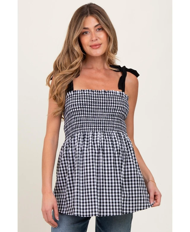 Pinkblush Maternity Black Gingham Smocked Shoulder Tie Top