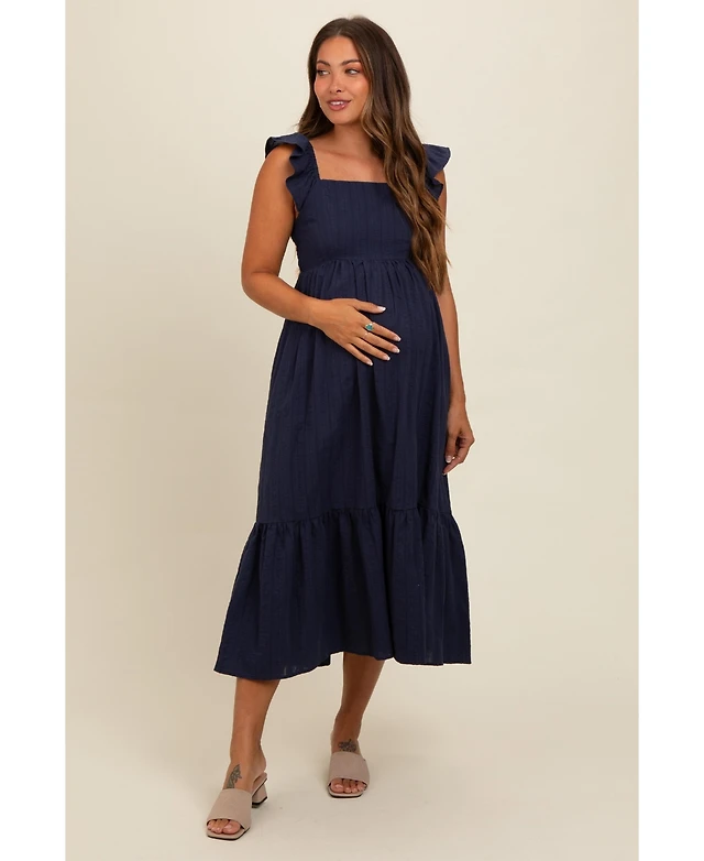 Pinkblush Maternity Navy Blue Textured Cotton Ruffle Strap Midi Dress