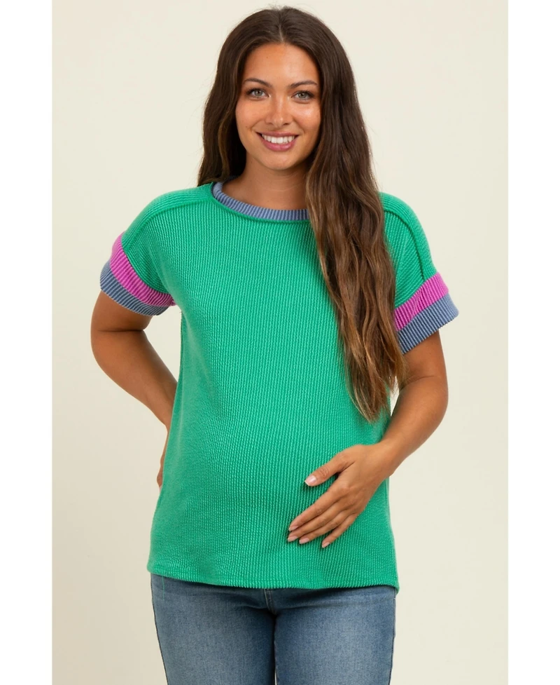 Refresh your maternity style with our Ribbed Colorblock Detail Maternity Short Sleeve Top! Featuring a flattering, stretchy ribbed fabric and trendy colorblock sleeves, this top is designed to grow with your bump for comfort at every stage. The lightweight, breathable material keeps you cool, while the classic crew neckline and relaxed fit make it perfect for everyday wear. Pair it with jeans or leggings for a fresh, casual look—before, during, and after pregnancy. Discover fashion that celebrates you and your journey with this versatile must-have!
