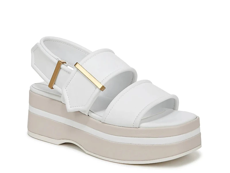 Lift warm weather looks with chic appeal with the Piper platform sandal from Franco Sarto. This slingback features a chunky midsole with a striped accent and metallic hardware accents on the thick straps for a subtle touch of shine.