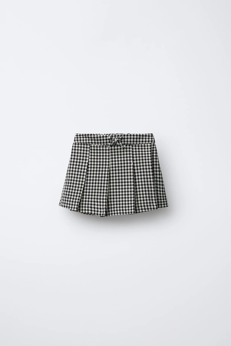 Skort with elastic waistband and front bow appliqué. Box pleat detail at front and plaid print.