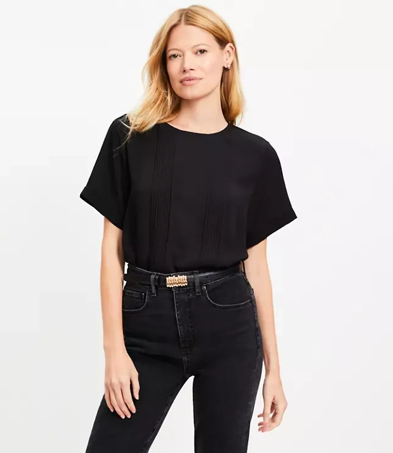Fluidly woven at front and softly knit at back, this top is all about effortlessly modern polish. Round neck Short sleeves Back button keyhole. Shirttail hem, Bullet1: 23 1/8"long, Imported:, Fit: Relaxed an easy shape that's just shy of loose, Length: Regular - hits below natural waist, Fabrication: Front Body 100% Polyester, Back Body: 100% Rayon, Garment Care: Machine Washable Loft Pleated Mixed Media Top Size Large Black Women's by Loft Size Regular - L Black Women's Tops, Front Body: 100% Polyester Back Body: 100% Rayon Machine Washable