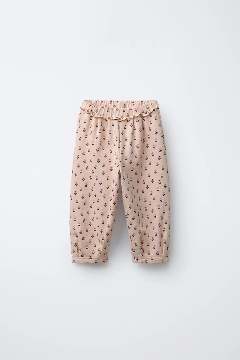 Plush balloon pants with elastic waistband and ruffled appliqué. Floral print.