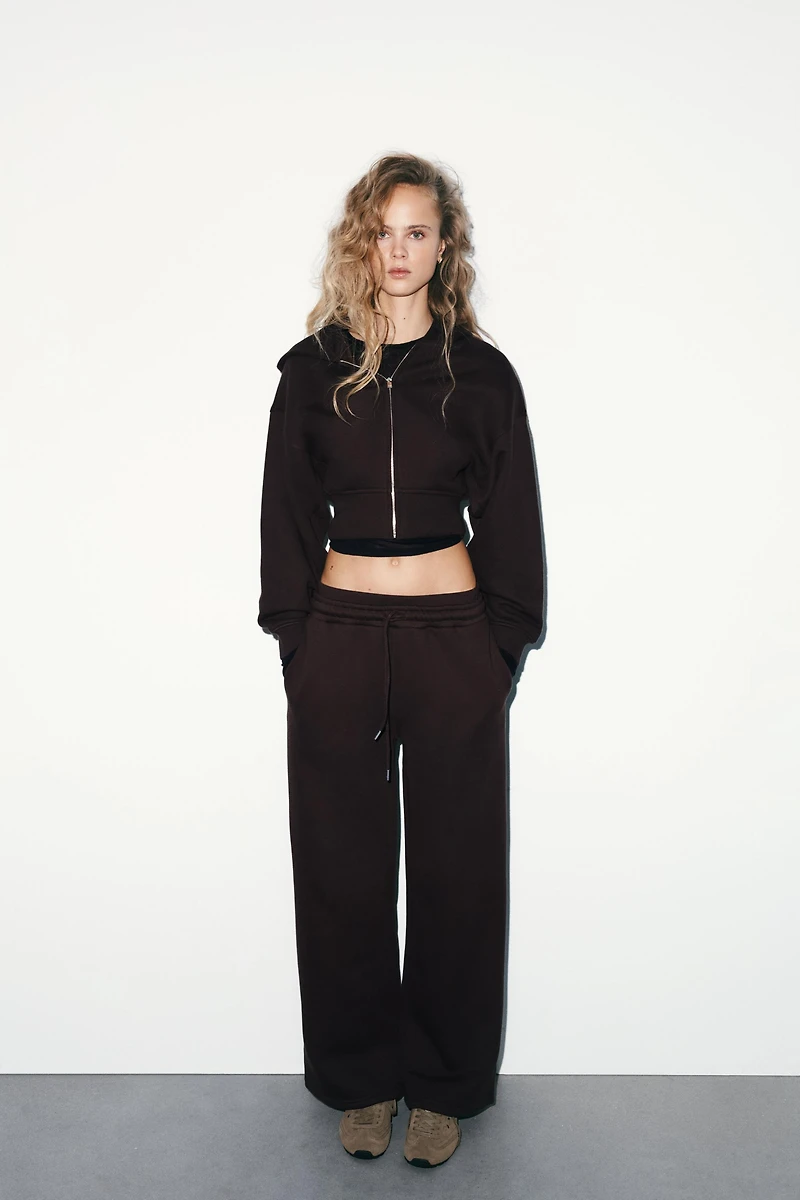 Pants made of cotton blend yarn. Mid-rise with an adjustable elastic drawstring waistband. Hidden side seam pockets. Straight leg.