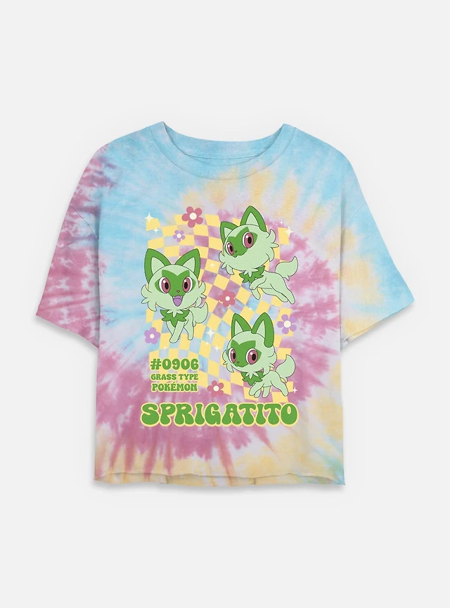 Pokemon Sprigatito Grass Type Checkered Tie Dye Crop Womens T-Shirt