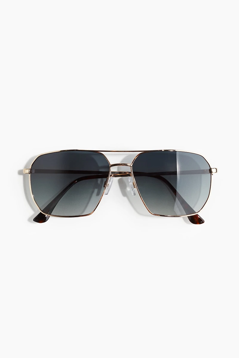 Aviator-style sunglasses with metal frames, metal sidepieces, and tinted, UV-protective polarized lenses. Adjustable nose pads. Polarized lenses show colors more clearly and provide stronger contrast while preventing glare.