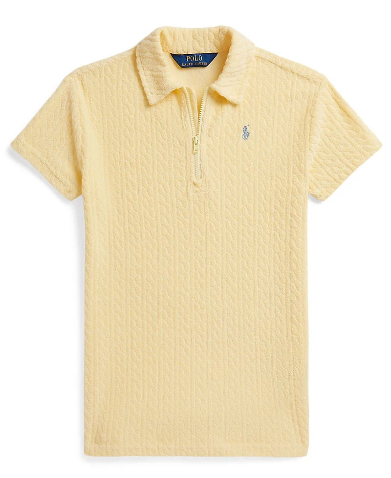 Bring classic Polo style to beach trips and pool days with this Ralph Lauren cover-up dress, crafted from textured cotton-blend terry with a cable-knit motif. Short dropped-shoulder sleeves, a Polo collar, and a quarter-zip placket frame the signature embroidered Pony for a polished, playful look.