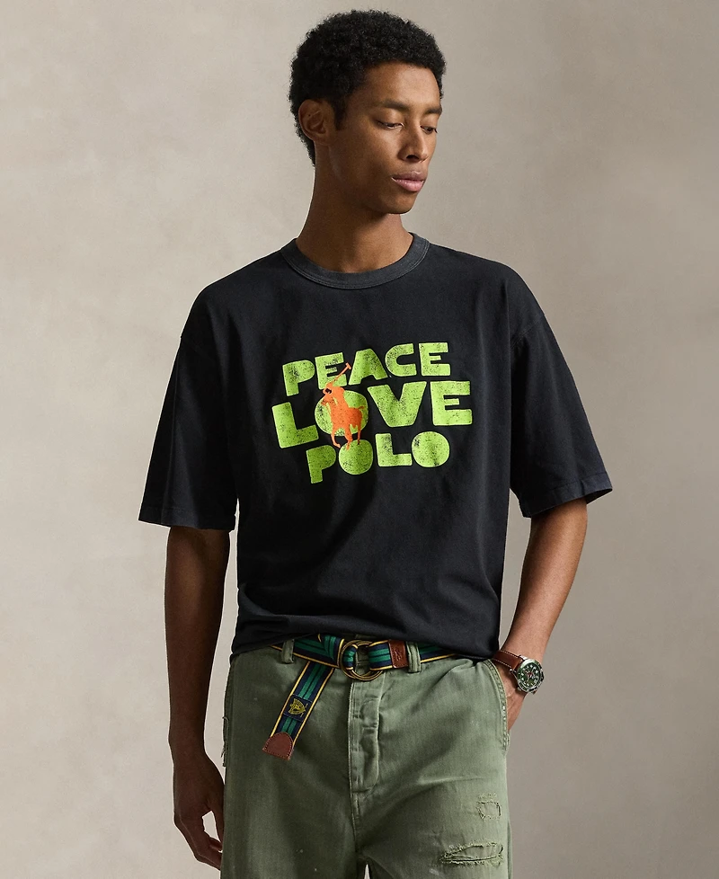 Peace Love Polo graphic and signature Pony printed at center front bring bold expression to this classic-fit T-shirt from Polo Ralph Lauren, designed with crewneck and short sleeves. Fuller cut through chest, waist, and sleeve ensures comfortable all-day wear.