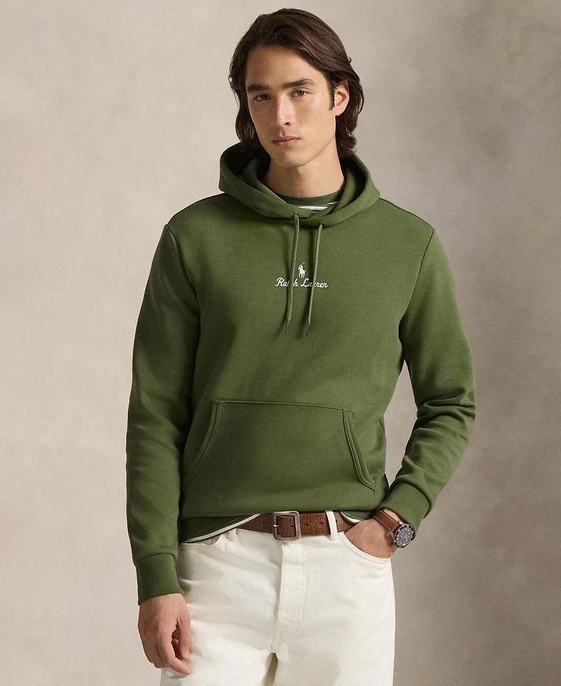 Signature branding is prominently displayed through embroidered script on this Polo Ralph Lauren double-knit hoodie. Ribbed cuffs, a drawstring hood, and a kangaroo pocket deliver timeless comfort.