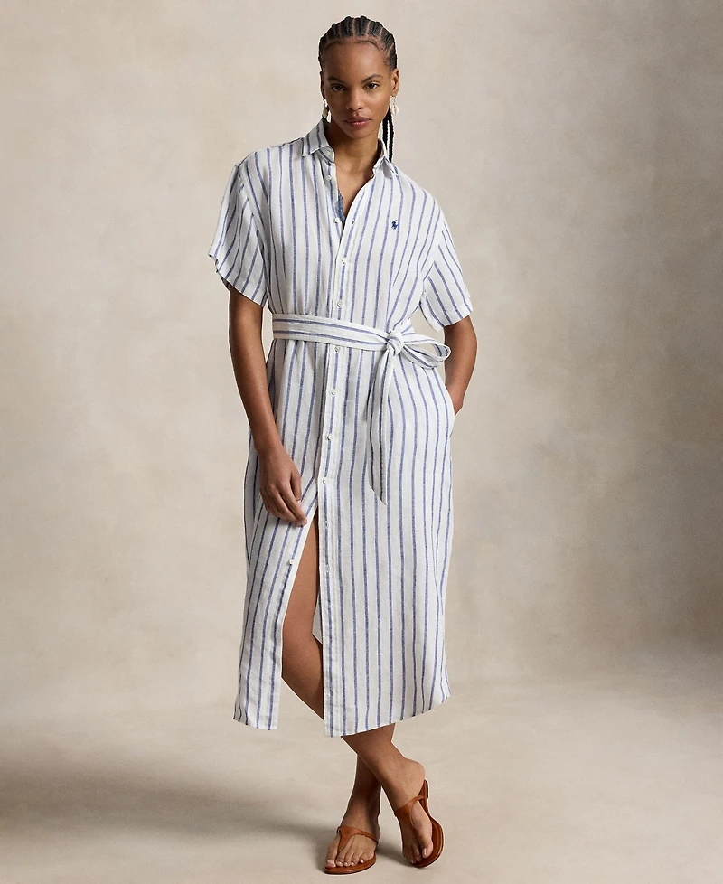 Woven and striped linen brings lightweight movement to this straight-fitting shirtdress from Polo Ralph Lauren, which is accented with a self-belt and embroidered with the signature Pony at the chest.