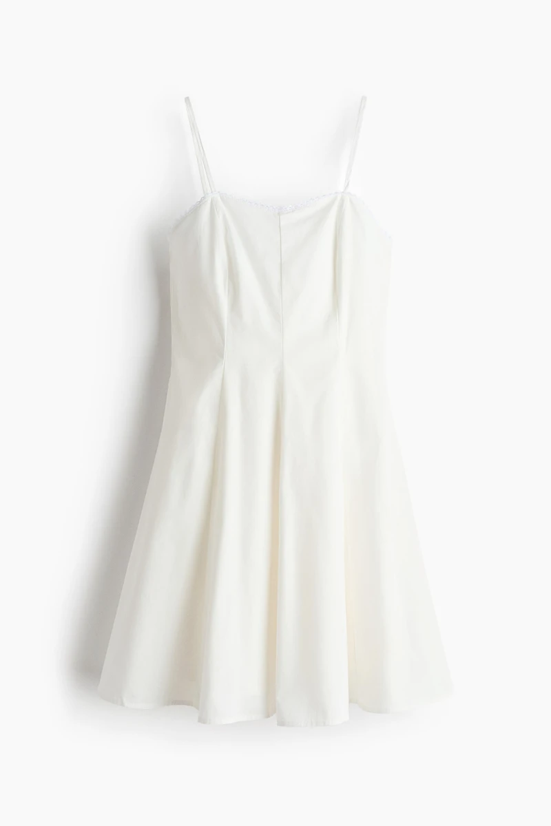 Short dress in crisp cotton poplin with a fitted bodice and flared skirt. Narrow, adjustable shoulder straps, picot-trimmed sweetheart neckline, and a concealed zipper at back. Visible vertical seams at front and back. Lined.