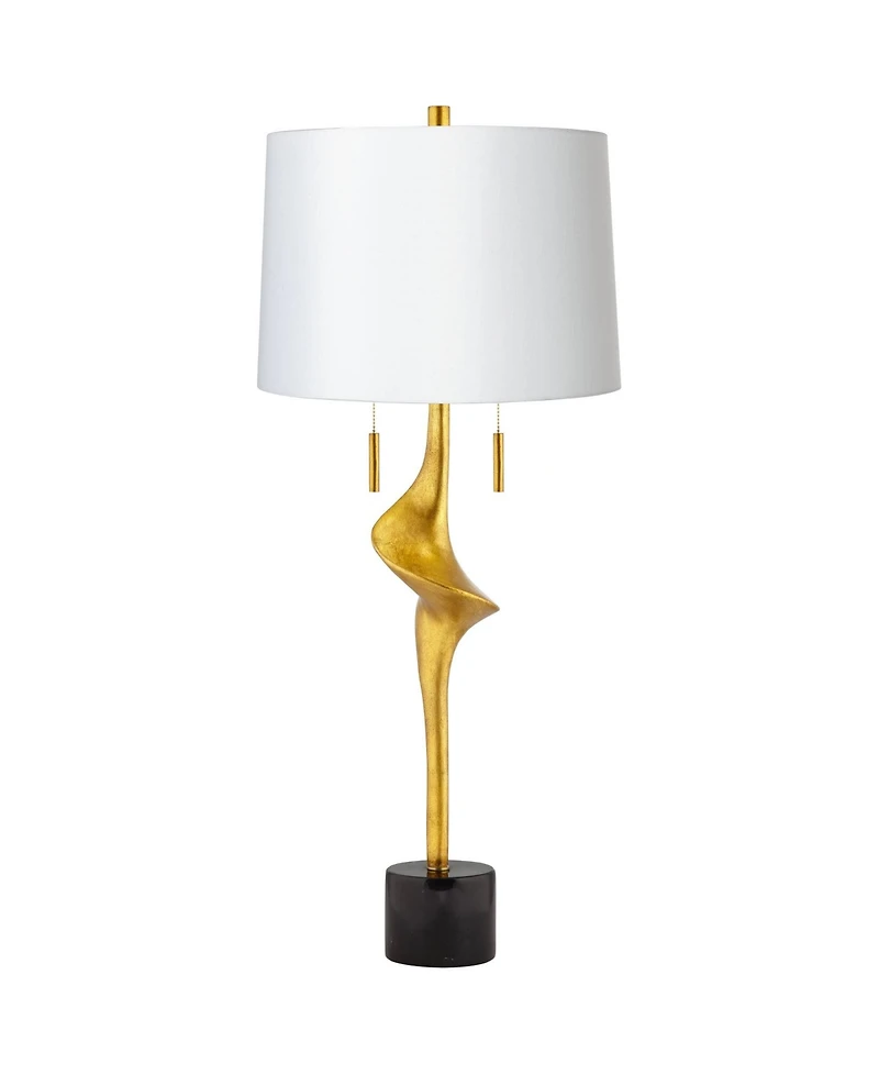 Add designer style to your decor with this gold leaf finish table lamp from the Possini Euro Design brand. The design features a twist base in metal done in a brilliant gold leaf finish that beautifully contrasts against the black round base. A white drum up top provides the perfect finishing touch to the design. Operate the two light bulbs with the pull chain feature, which gives you easy lighting control. Also comes with a bonus black shade that has a gold finish liner.