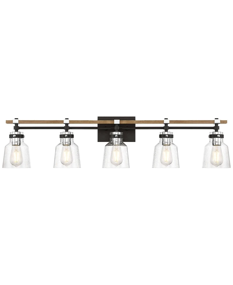 Embrace an updated theme in contemporary spaces softened with charming transitional themes. Perfect for highlighting a spacious vanity, this modern five-light bath light from the Broadway collection by Possini Euro Design offers a slight industrial motif with clear seedy glass jar shades and a black finish frame. A painted wood bar and chrome finish accents completes the look.