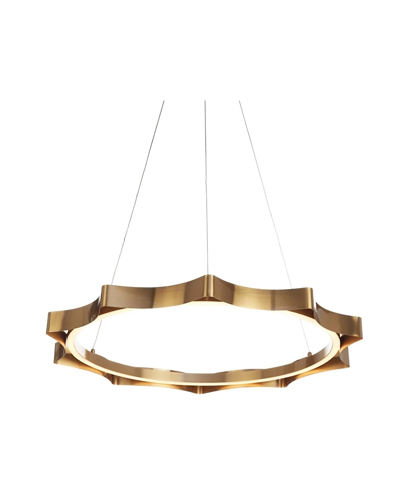 From the Possini Euro Design brand, the Gearworks ring pendant light embraces the sharp edges and eye-catching design of industrial style. Reminiscent of a large gear, this brass finish fixture uses a integrated Led ring module to evenly distribute illumination throughout your room. The slender shape creates a space-saving look perfect for dining areas.