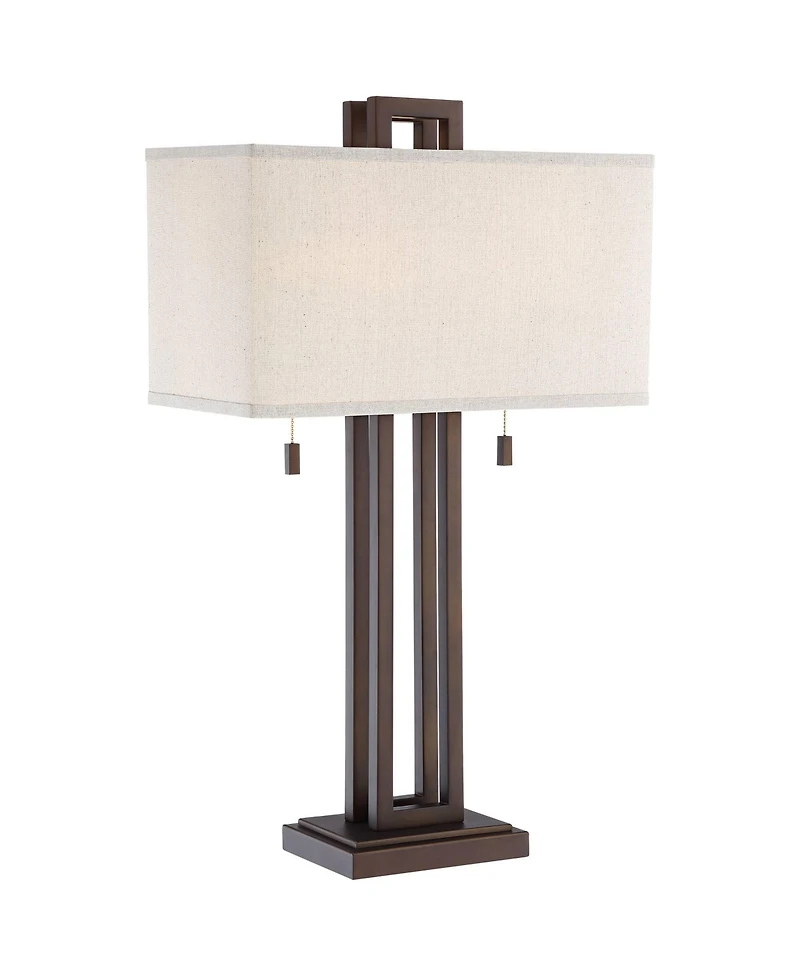 This sleek table lamp has a contemporary look and feel. Features a bronze finish open metal body and a rectangular box shade. Twin on-off pull chains let you control the light output. From the Possini Euro Design brand, this lamp also comes with a tabletop line cord dimmer, which allows you to control the level of lighting. The dimmer has a handy Usb charging port for charging phones and more. Simply insert the lamp plug into the dimmer outlet, and then slide the switch on the control to dim or brighten the lighting.