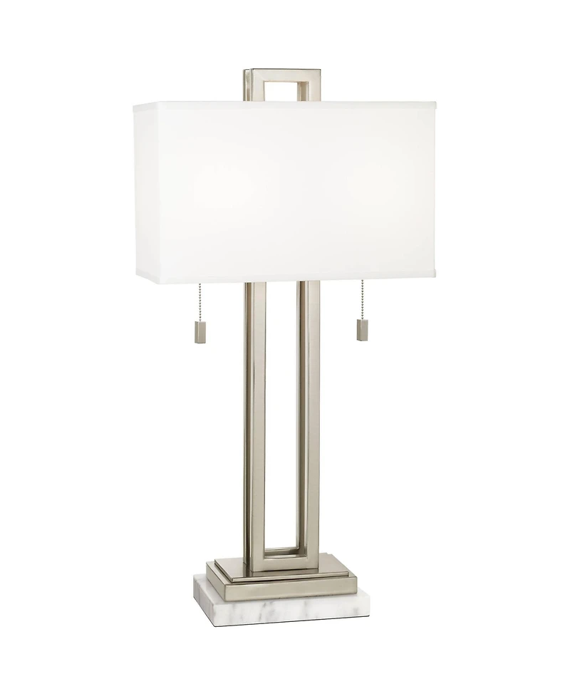 This sleek table lamp with riser has a contemporary look and feel. Features a nickel finish open metal body and a rectangular box shade. Twin on-off pull chains let you control the light output. Each lamp includes White Marble Riser.
