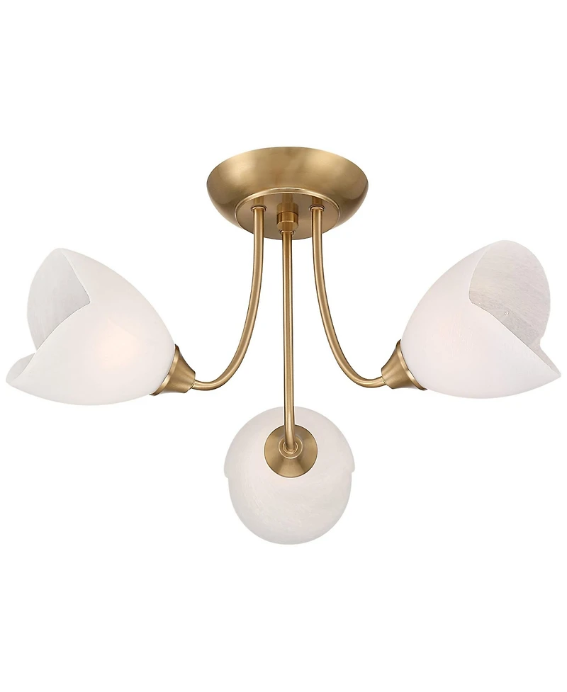 Organic forms combine with contemporary design aesthetics to create the beautifully modern style Nessa three light semi-flush ceiling light, from the Possini Euro Design brand. Three white frosted swirl glass shades shaped like elegant tulips extend outward from the warm brass finish canopy on matching warm brass finish stems, functioning as an elegant garden on your ceiling, providing illumination from the three bulbs. Dry location rated, the Nessa ceiling light is perfect for bringing light to your bedroom or living spaces.