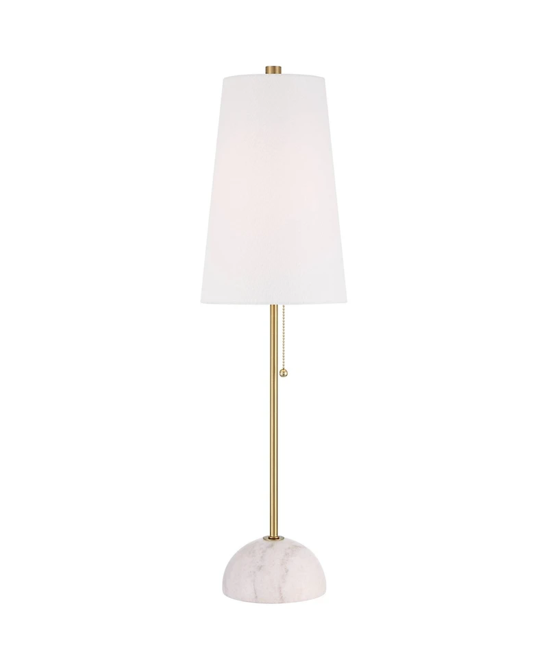 A bright look for your contemporary modern room decor, the Paige table lamp features a tall and slender profile. From the Possini Euro Design brand, the look is ideal for illuminating buffet tables in the dining room or console living room tables. It features a brass finish pole with a white marble base. A white fabric tapered shade is on top.