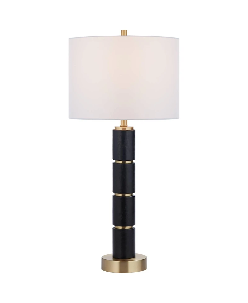 The Rainier column table lamp, from the Possini Euro Design brand, cuts an impressing modern style figure in your living space. This unique piece has a black faux leather wrapped base with brushed brass finish metal accents, creating an eye-catching lesson in contemporary home lighting. The bright bulb sits underneath a white fabric drum shade, drawing the eye and directing illumination down for tasks, such as reading.
