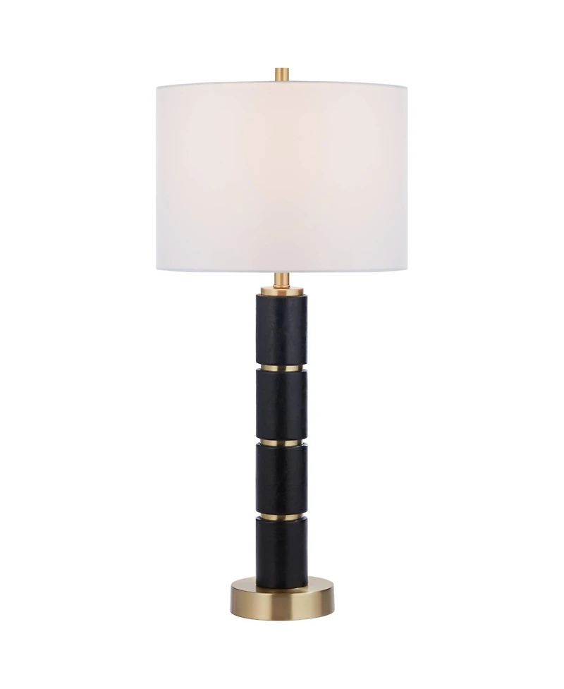 The Rainier column table lamp, from the Possini Euro Design brand, cuts an impressing modern style figure in your living space. This unique piece has a black faux leather wrapped base with brushed brass finish metal accents, creating an eye-catching lesson in contemporary home lighting. The bright bulb sits underneath a white fabric drum shade, drawing the eye and directing illumination down for tasks, such as reading. This lamp comes with a tabletop dimmer, which allows you to control the level of lighting. Simply insert the lamp plug into the dimmer outlet, and then slide the switch on the control to dim or brighten the lighting. Dimmer is compatible with halogen and incandescent bulbs, and most dimmable Cfl and Led bulb designs.