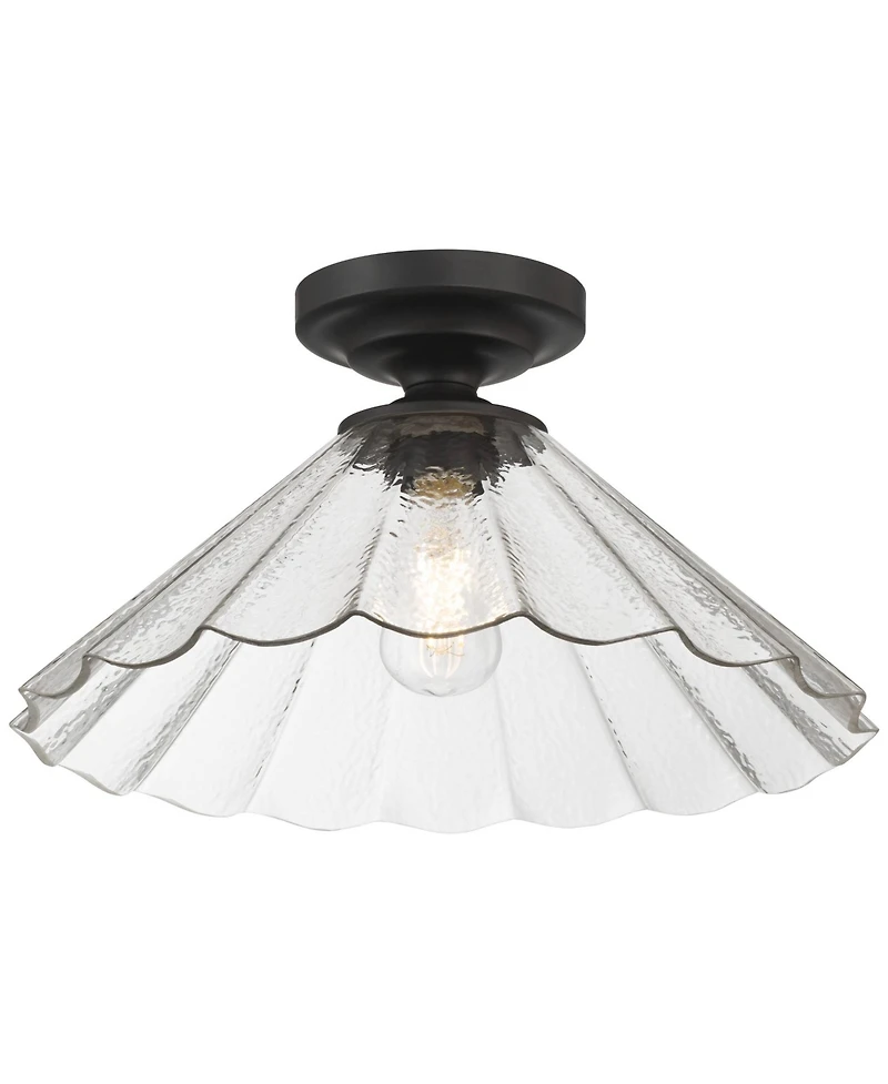 This lovely semi-flush mount Vandross ceiling light, from the Possini Euro Design brand, blends timeless elegance with classy contemporary modern style. A beautiful cast clear glass shade encircles the partially exposed bulb for a touch of rustic charm, enhanced by the matte black finish canopy and frame. The Vandross ceiling light is dry location rated for indoor use, and a great way to light up a bedroom, breakfast nook, or smaller living space.