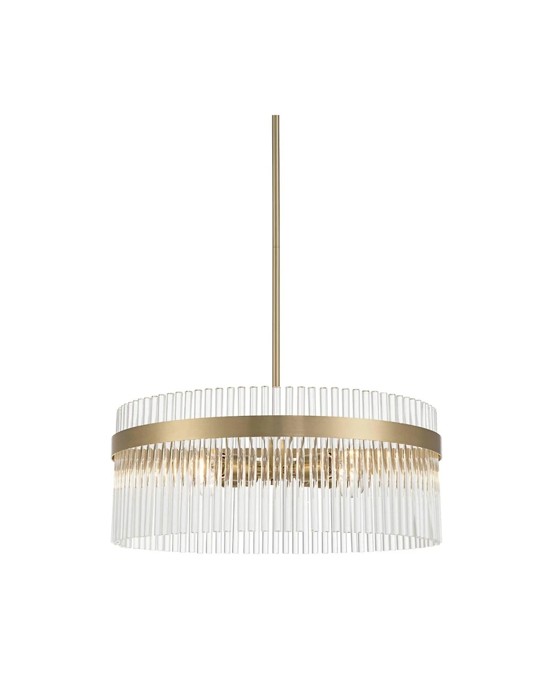 Glittering crystals make an elegant statement with the Thaisha four light chandelier, from the Possini Euro Design brand. Slender rods of clear crystal are attached to a brass finish metal frame encircling four bright bulbs, creating beautiful visual interest and texture in your home and light cascades through glass. Elegant and contemporary, this modern style chandelier is a charming statement piece in a small size presentation, perfect for lighting up smaller dining areas and living spaces.