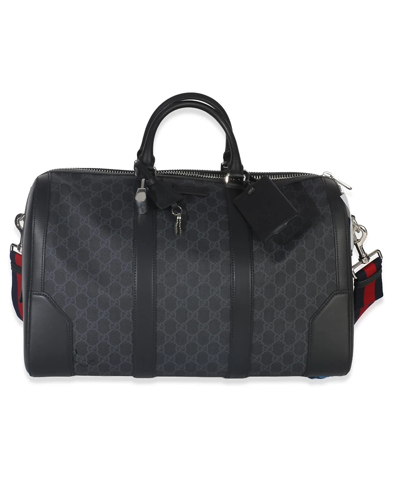 Authentic pre-owned Gucci large carry-on duffle bag for men. Crafted using black Gg Supreme canvas, it has leather trims, silver-tone hardware, two short handles on top, and an optional shoulder Web strap. Built for short trips and packed weekends.