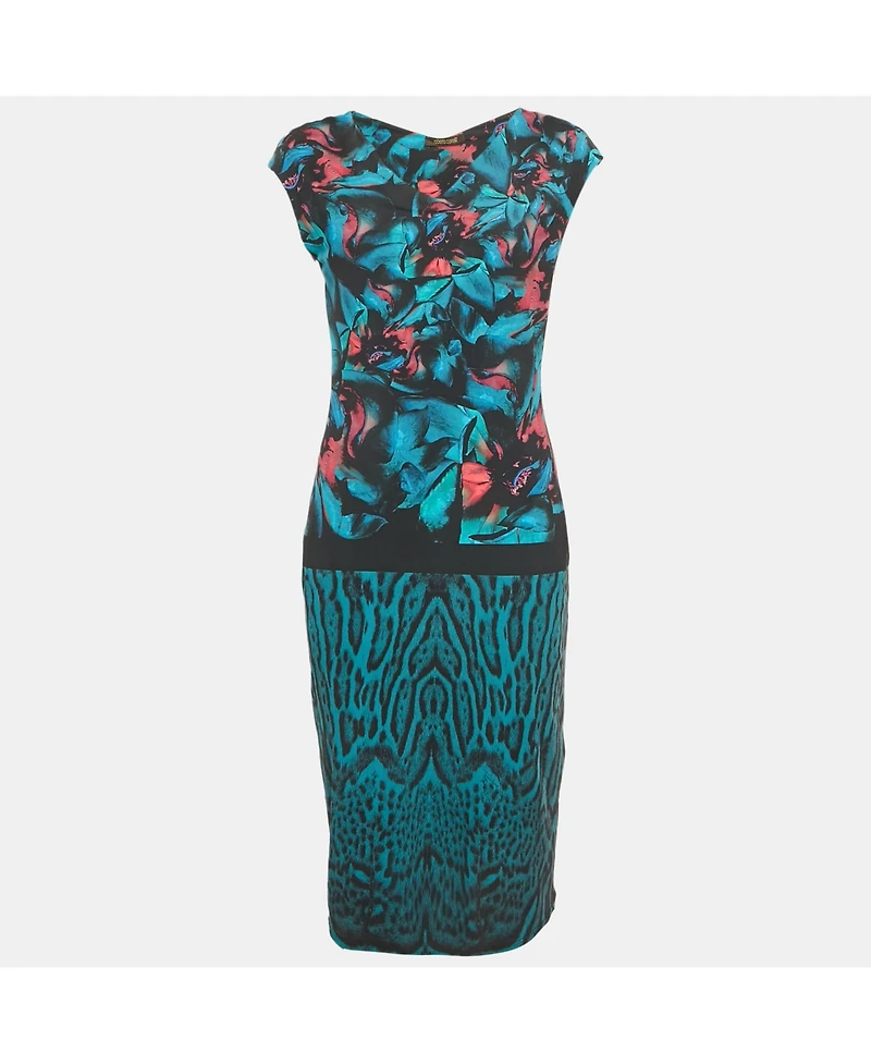 Pre-Owned Roberto Cavalli Women's Blue Printed Jersey Midi Dress