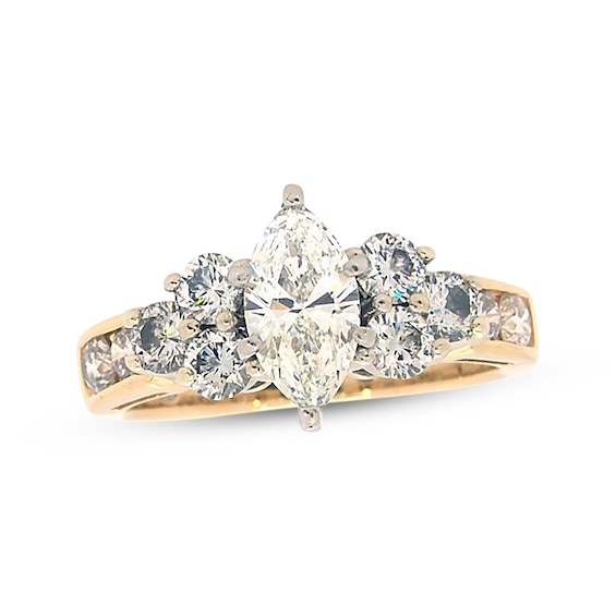 A magnificent marquise-cut diamond shines even brighter amidst stunning trios of round-cut diamonds in this beautiful engagement ring for her. Additional channel-set round diamonds line the band to complete the look. Styled in gleaming 14k yellow and white gold, the ring has a total diamond weight of 1 3/4 carats.