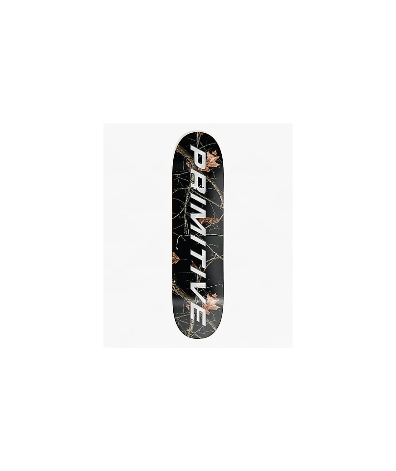 The skaters at Primitive introduce the 8.5" wide Night Owl skateboard deck in a classic 32" length with a popular 14.5" wheelbase. Showing italicized branding across the bottom with a realistic woodland camo background over a black backdrop to look l